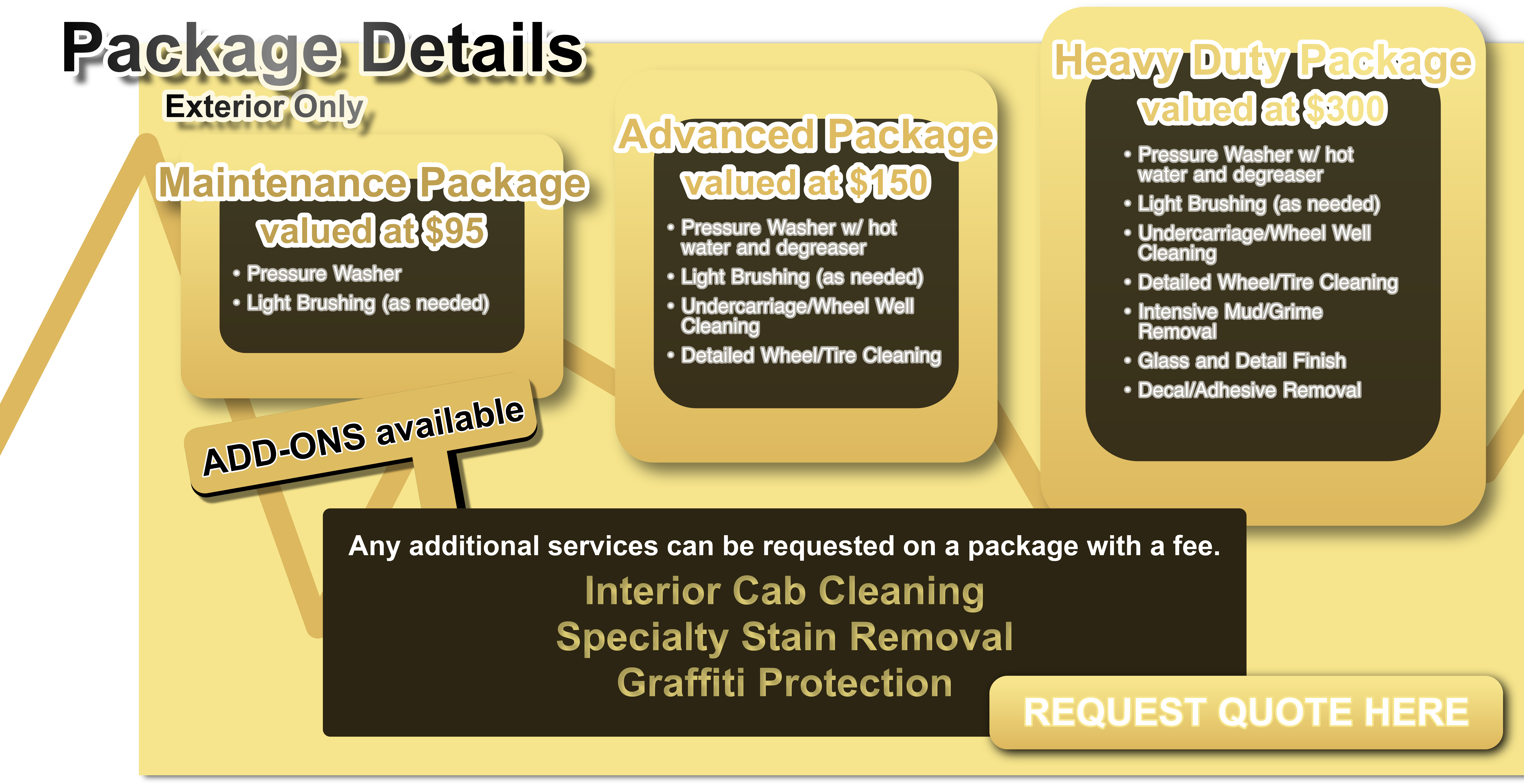Municipal Equipment (garbage trucks, street sweepers, etc.) If you have a specific piece of equipment not listed, please contact us to discuss your needs. We’re equipped to handle most heavy-duty cleaning challenges.